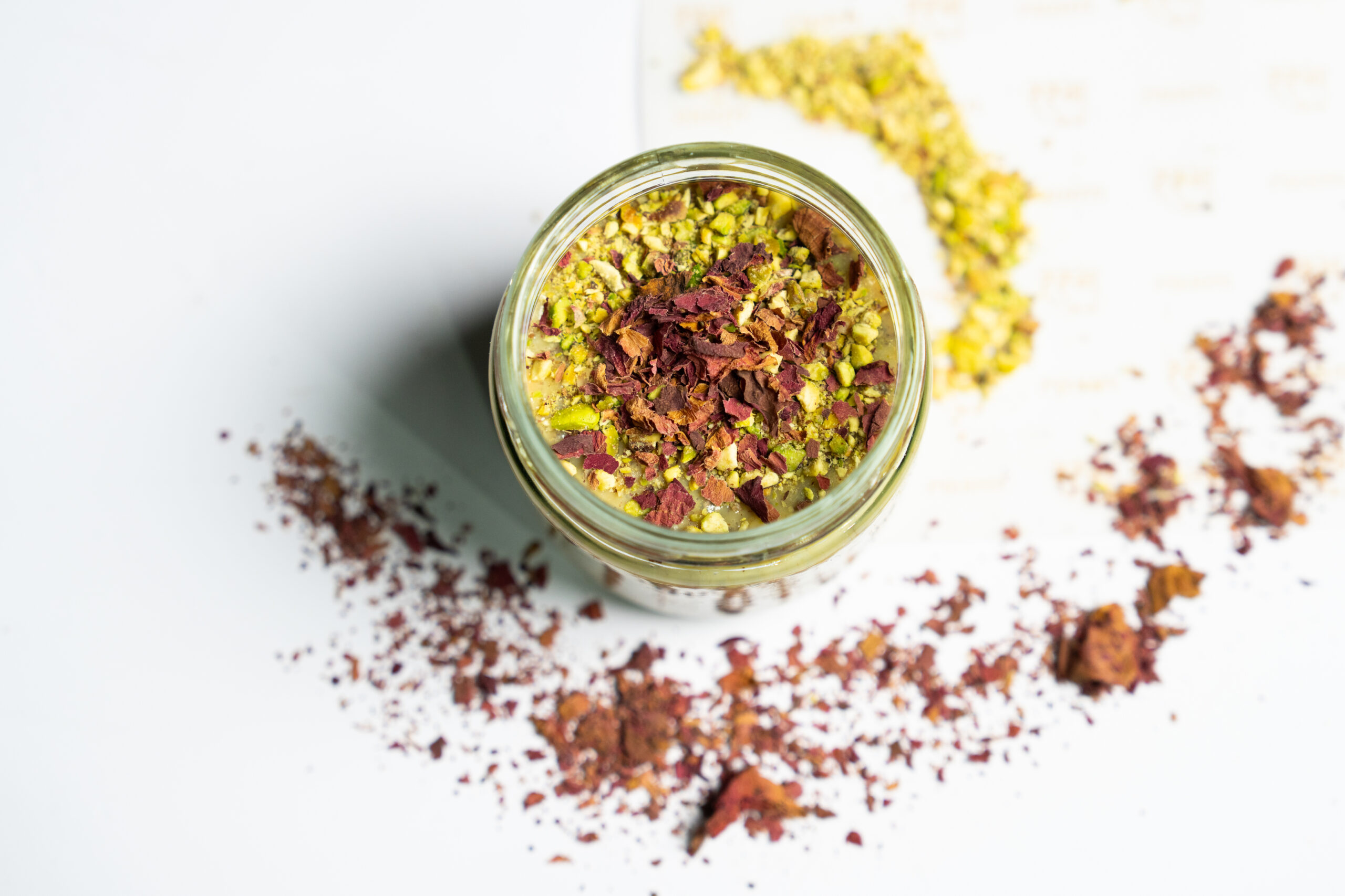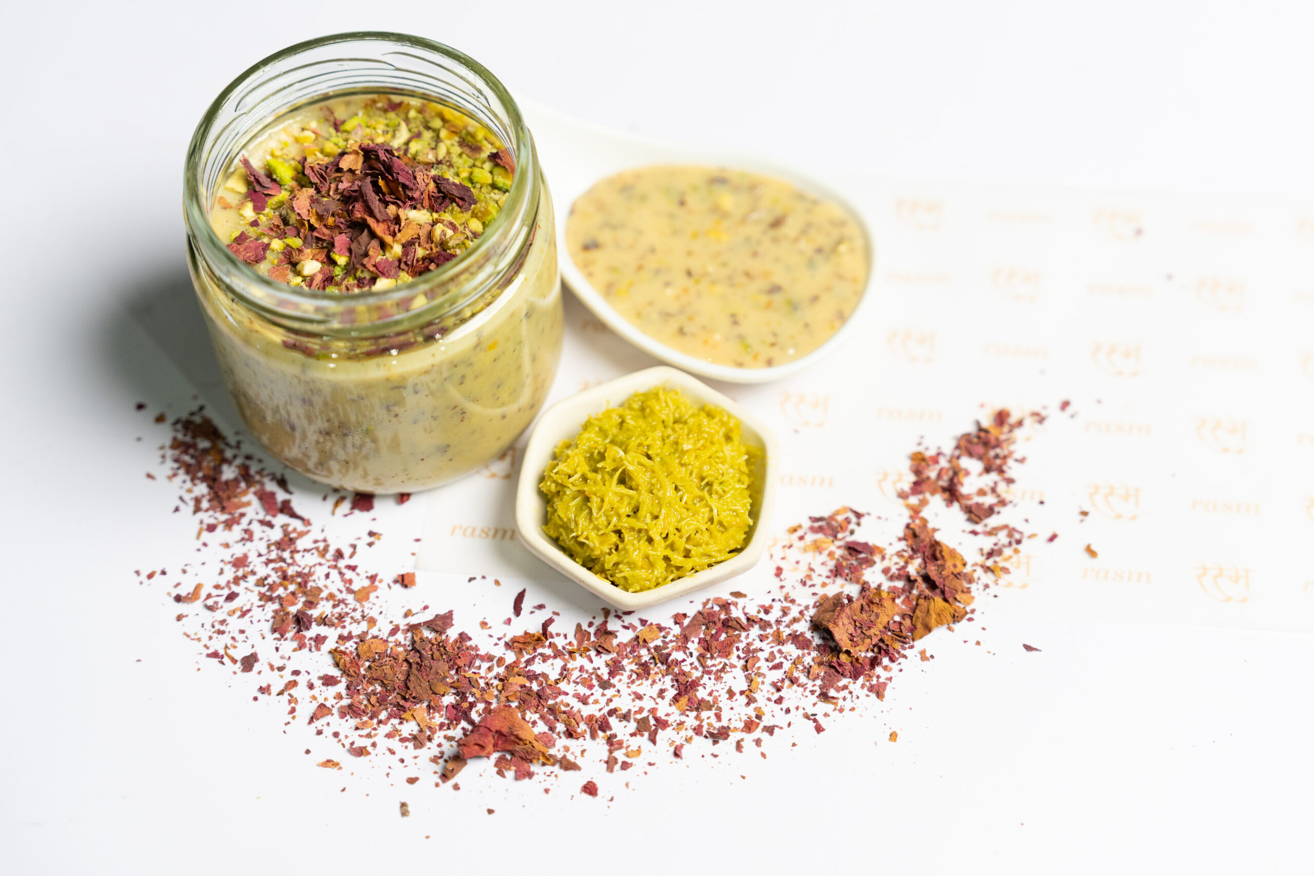 A divine trio — rich white chocolate fudge, rose petals from Shrinathji & pistachio crumble.